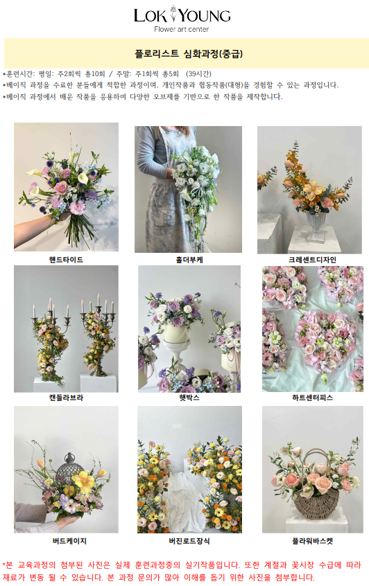 실제 플로리스트의 실무에 가까운 경험을 할 수 있도록 구성되어 있습니다.